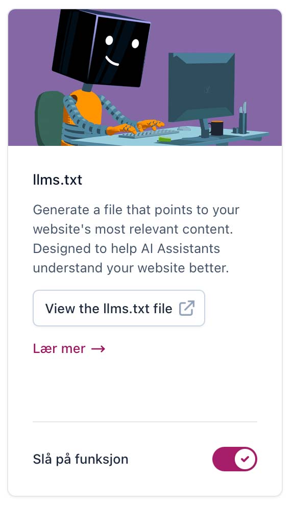 Om du bruker WordPress nettsider med SEO-utvidelsen Yoast, kan du på "Innstillinger" aktivere llms.txt. Dette er en tekstfil som peker til nettstedets mest relevante innhold, for å hjelpe AI-assistenter å forstå nettsidene bedre.